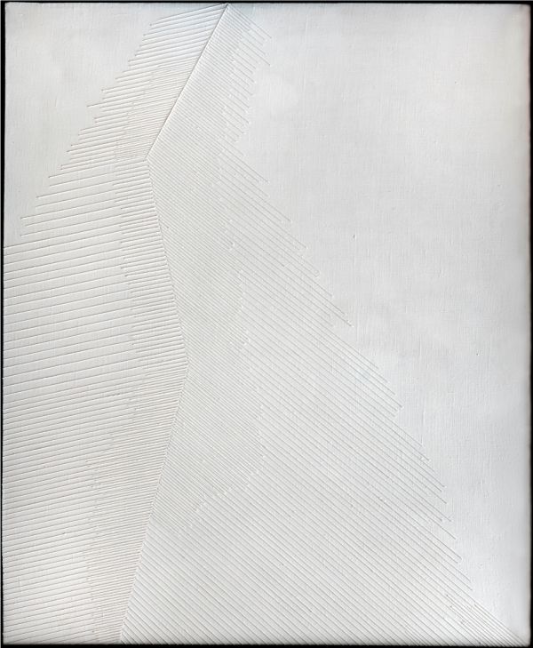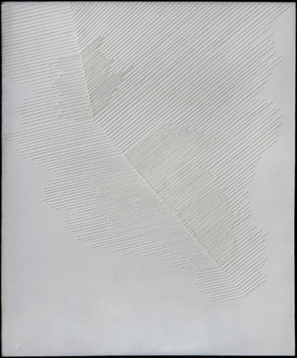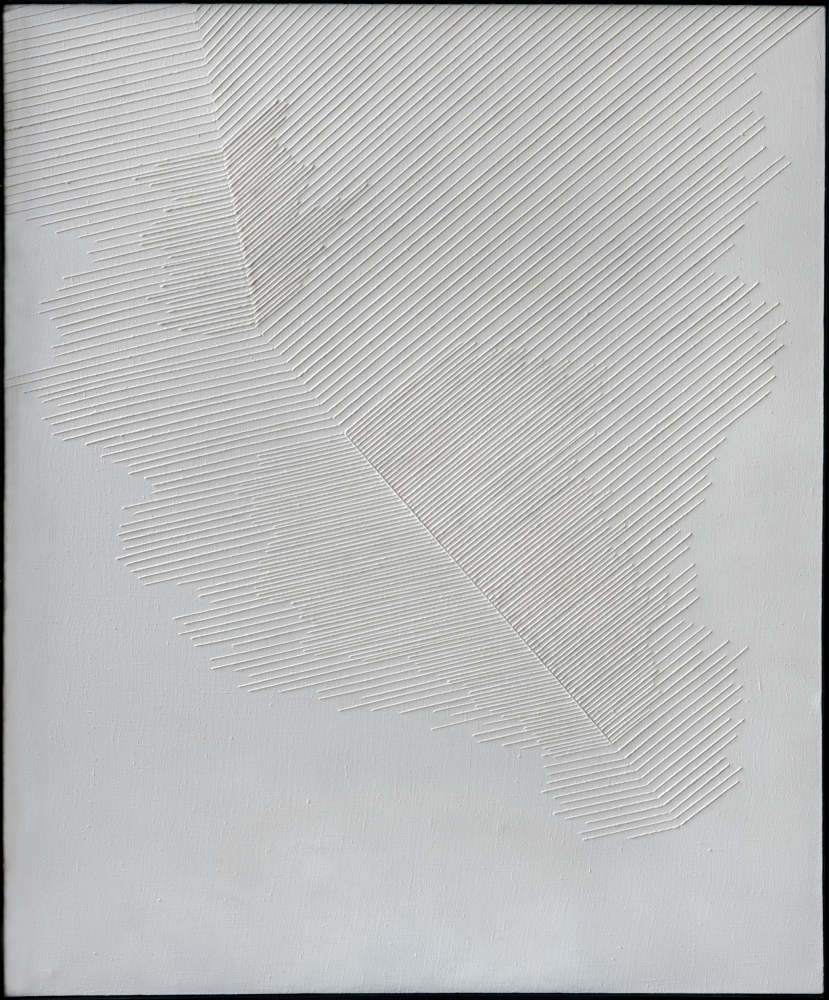 …Ascetyczne kompozycje sznurkowe (białe i czarna) wydają się minimalistycznymi wypowiedziami, w których prostota geometrii przenika się z delikatnością bardziej organicznych form, ład z potrzebą uchwycenia indywidualnej wrażliwości oka, umysłu, ręki. Tym razem zostały pokazane ich wielkoskalowe wersje. Można w nich widzieć nie tylko realizację wysublimowanych poszukiwań formalnych, ale też uogólnione wrażenia z nigdy dostatecznie niezgłębionego świata przyrody czy pejzażu. Można dostrzegać również ciągłe nawracanie do pytań o naturę obrazu, o jego sposób bycia w polu widzenia, w otoczeniu, o sposoby niuansowania powierzchni płótna, wydobywania przestrzeni. Zrytmizowane, równoległe, diagonalne linie przymocowanych i zamalowanych sznurków witalizują nieme podobrazia. Tworząca się faktura, precyzyjnie, a zarazem dyskretnie utkana z pasków zestawionych pod różnymi kątami operuje wypukłością, grą światła i cienia, a zarazem migotliwym ruchem powstałym pod wpływem naturalnego oświetlenia i zmian punktu widzenia odbiorcy. Oddziałuje tak charakterystyczna dla twórcy, subtelna dynamika. Dzięki niej obraz nie jest zastygłym w sobie przedmiotem do kontemplacji, choć poprzez asocjacje użytej bieli albo czerni– wnosi również wyciszającą jakość, a także metaforyczne sensy i estetyczną wartość.