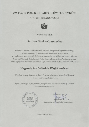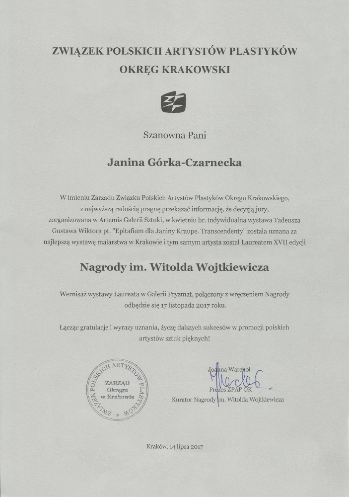 Miło nam poinformować, że zorganizowana przez nas wystawa indywidualna prof. Tadeusza Gustawa WIKTORA Epitafium dla Janiny Kraupe. Transcendenty została uznana za najlepszą wystawę malarstwa w Krakowie i tym samym artysta został Laureatem XVII edycji Nagrody im. Witolda Wojtkiewicza, przyznawanej przez Zarząd Związku Polskich Artystów Plastyków Okręgu Krakowskiego.