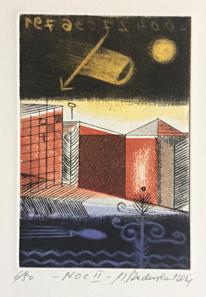 Powrót do: OfertaGrafikaSTACHURSKA MałgorzataNoc IIRok powstania: 2004Technika: akwaforta, akwatinta, papierWymiary: 13x8,5 cmNr odbitki: 6/50Zapytaj o tę grafikęcena:550zł+ Wybór